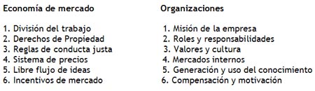 La historia ha demostrado que la economía de mercado es mucho más exitosa en la coordinación de actividades que la planificación central del socialismo. Como ejemplo, podemos observar las diferencias entre lo que fueron Alemania Occidental y Oriental, Hong Kong y la China comunista, o Corea del Norte y del Sur. Ahora, ¿qué podemos aprender de ello para transmitirlo al funcionamiento interno de las empresas? Observemos el siguiente cuadro:
