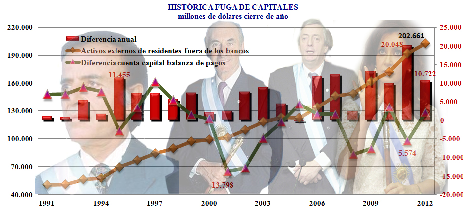 Y así se llega a la situación del primer mandato completo de Cristina Kirchner y primer año del segundo, en el que persiste el viento de cola del mundo, pero con el agregado de la intervención del Indec a comienzos de 2007 y la crisis del campo a mediados de 2008, hasta llegar al cepo cambiario desde fines de octubre de 2011 y su profundización en el año siguiente, en un contexto de insostenible brecha entre la suba de la emisión monetaria, el gasto público, los salarios y la presión tributaria con la tasa de devaluación nominal del peso. Así, se profundizó la fuga de capitales hasta diciembre de 2012 a un ritmo de u$s11.250 millones por año.