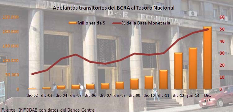 Desde entonces se constituyó en una forma fácil de suplir el renunciamiento a una política de austeridad fiscal, esto es que el gasto no supere el nivel de los ingresos, y de cierre al financiamiento externo a bajas tasas de interés, en particular desde 2005 cuando los adelantos transitorios del BCRA vuelven a superar largamente el 20% de la base monetaria, como promedio del año, salta a 30,6% en 2010 y actualmente se ubica en 47,1% de esa referencia.