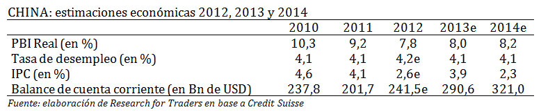 Los últimos números de China, si bien positivos, todavía no nos dan suficiente confort para establecer un cambio de tendencia en el crecimiento pero sí suficiente para marcar algunos parámetros sobre cómo va a ser 2013. Los números del último trimestre de China, que creció 7,9%, tienen dos datos negativos y uno positivo. Desde el lado negativo vemos que el crecimiento viene con un importante trimestre en exportaciones (el sector externo representa el 25% del PBI de China) y el segundo punto negativo es que mucho de este crecimiento viene liderado por la inversión pública. En lo positivo se ve que el consumo interno de a poco se va fortaleciendo. Esto nos garantizaría crecimiento sostenido durante al menos la primer mitad de este año.