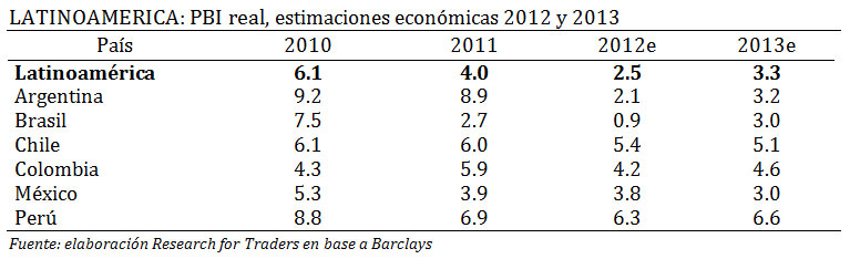 Por su parte, las economías latinoamericanas han moderado sus crecimientos económicos en los últimos años. Esto se explica fundamentalmente por dos factores: la crisis europea y la desaceleración de China. Las relaciones comerciales entre los países de la región y el país asiático han tomado una gran importancia relativa dentro del producto de Latinoamérica, y es por eso que, una mayor demanda de productos básicos de China en virtud de su propio crecimiento, actuaría como un motor para impulsar a las economías de América Latina. Esperamos en 2013 seis u ocho meses de inercia positiva que apoyaría el crecimiento de Latinoamérica. China acelera y arrastra a Latinoamérica.