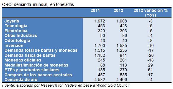 - En 2012, la demanda de oro de India cayó 12% en términos interanuales, a pesar que se registró una mejora en el último trimestre, con 864 toneladas.