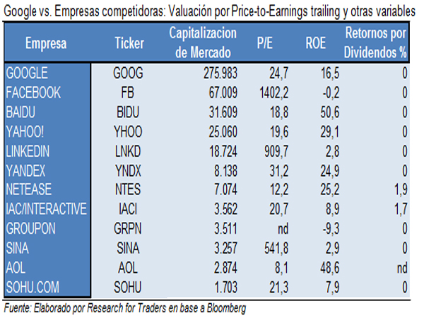 La empresa comenzó a cotizar en bolsa en 2004 con poco más de US$ 21 mil millones de capitalización bursátil y hoy vale unos US$ 276 mil millones. Pero la valuación se ha ido sincerando mucho a lo largo de los años. Ahora que Google ha confirmado las expectativas que se tenían, su valuación ha vuelto a subir, con un ratio precio-ganancias de 22 y 18 años si computamos la estimación de ganancias del corriente año, bien por encima de Apple, y de su competidora más directa en términos de tamaño como lo es la china Baidu (cotiza a 18 veces ganancias trailing).
