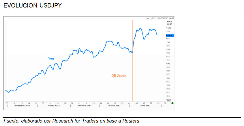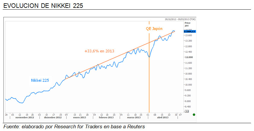 A principios de abril, Japón se sumó a los países de grandes emisiones monetarias y los mercados de riesgo le dieron la bienvenida. Al igual que la Reserva Federal lo hace en EEUU, el Banco de Japón (BoJ) decidió aplicar una flexibilización cuantitativa, esto es la compra de activos y la inyección por esta vía de dinero en la economía, con el objetivo de revertir la deflación (con objetivos cuantitativos bien definidos) y apuntalar la economía.