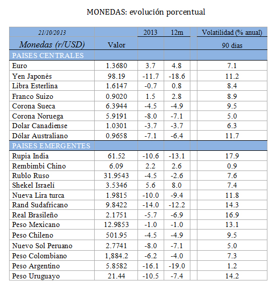 Las recuperaciones producidas desde agosto pasado a la fecha han reducido mucho las caídas previas. Vale la pena recordar algunos episodios de stress para algunas de economías emergentes como el real brasileño, que perdió un 51% en 2001/02; la rupia indonesia, -86% en 1997/98, y la rupia india, que cayó 42% durante 1990/1992 . En 2000/01, la lira turca se contrajo 68% y el rand sudafricano 52%.