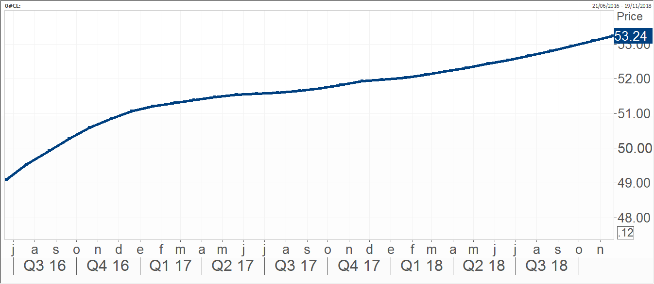 La curva de futuros nos muestra una pendiente bien positiva, aunque el WTI alcanzaría los 53,24 dólares para fines del año 2018.