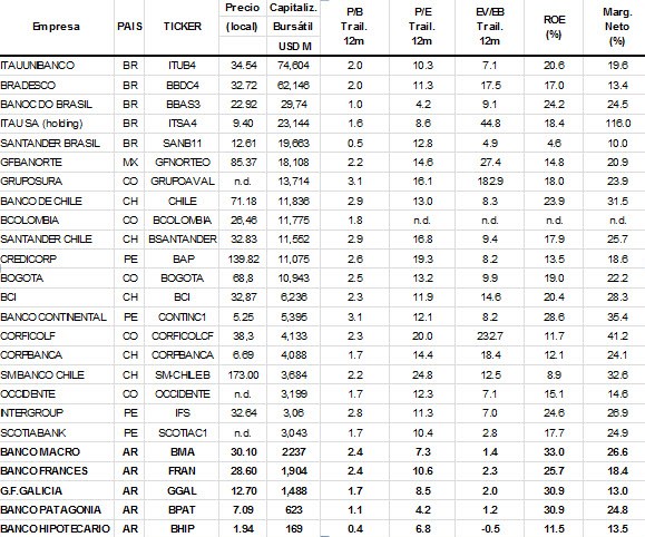 Observando la valuación relativa con otras entidades en Latinoamérica, las tres principales entidades en materia de liquidez poseen un claro descuento en materia de precio-ganancias por acción respecto a las entidades brasileñas, peruanas, chilenas, colombianas  y mexicanas, tal como se puede ver en la tabla debajo.