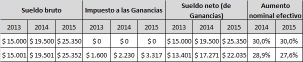 Siguiendo con el ejemplo previo de aumentos salariales del 30%, un trabajador que en 2013 ganaba $17.500, en 2015 tendrá un aumento nominal efectivo en torno al 19-20%, mientras que para uno que obtenía un salario bruto mensual de $50.000 en el primer año, en 2015 al aumento de su salario nominal será de alrededor 26-27%.