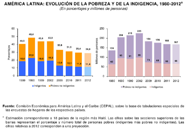 3º Momento: Desde el inicio de las políticas neoliberales (1970-2000) hasta la irrupción de Hugo Chavez (1999) en Venezuela; Luiz Ignacio Da Silva (2003-2011) y Dilma Rousseff (2011) en Brasil; Nestor Kirchner (2003-2007) y Cristina Fernández de Kirchner (2007) en Argentina; Rafael Correa (2007) en Ecuador; Daniel Ortega (2007) en Nicaragua; Evo Morales (2007) en Bolivia; Michelle Ballet (2006-2010) en Chile; José Manuel Zelaya Rosales (2006-2009) depuesto por un golpe de Estado en Honduras; Fernando Lugo (2008) en Paraguay, donde se organizó otro golpe de Estado (2012); José Mujica (2010) en Uruguay y el más recientemente electo Ollanta Humala (2011) en Perú. Estos gobiernos habían comprendido que no debía dejarse todo librado a la mano invisible y al mercado. Razón de ello fue la batería de políticas económicas y sociales que se impulsaron en la región, donde el eje de las transformaciones sociales es el Estado y no las políticas de ajuste y endeudamiento desmedido, que en algunos casos era sugerido por organismos internacionales. Los resultados, en materia económico-social, pueden apreciarse en los informes Panorama Social de América Latina 2012 de la Cepal y La movilidad económica y el crecimiento de la clase media en América Latina del Banco Mundial (2012). Según la Cepal entre 2002 y 2012 los pobres no indigentes pasaron de 225 a 167 millones en América Latina: unos 58 millones dejaron de ser pobres no indigentes. Por otro lado, la cantidad de indigentes paso, mismo período, de 99 a 66 millones de personas, lo que significa que dejaron de ser indigentes unos 33 millones de personas.