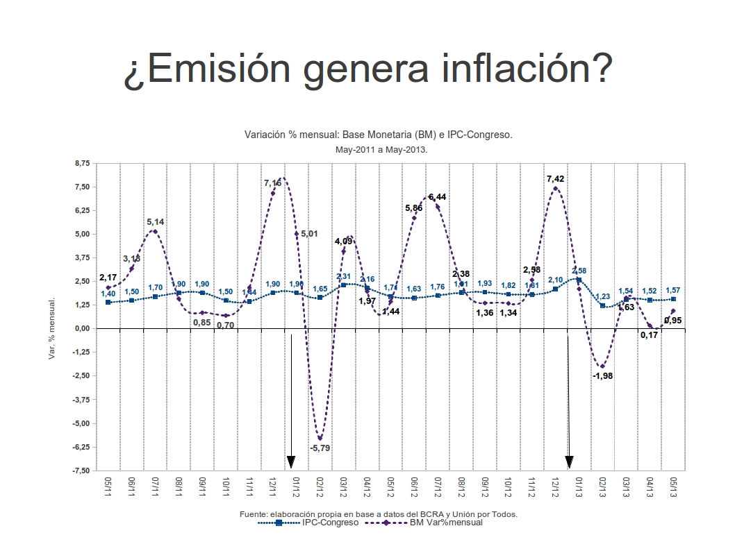 Si tomamos todo el periodo de mayo de 2011 a mayo de 2013 se demuestra que la estabilidad de la variación de los precios no tiene relación con las variaciones porcentuales de la base monetaria. Se puede inferir que puede existir una leve correlación entre ambas pero nunca que existe causalidad entre emisión e inflación. No hay que olvidar la dudosa procedencia de los datos del IPC-Congreso que antes comprendía a 14 consultoras y que actualmente son 20.