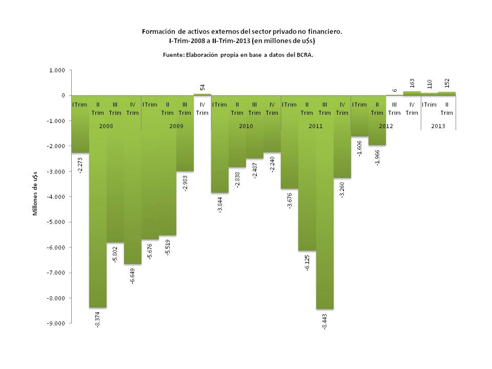 Pero observemos los números de la liquidación de divisas. Porque unos de los problemas de la restricción externa tiene relación con la variable divisas. Que son necesarias para importar los productos que no se fabrican en el país o el pago de intereses de la deuda (fueron unos casi u$s 173.000 millones) o giro de utilidades y dividendos. Según el informe de coyuntura del Centro de Estudios Económicos y Sociales (CESO), las importaciones continúan su tendencia alcista en estos primeros diez meses de 2013. Las reservas internacionales, según este informe de octubre de 2013, totalizaron u$s 33.971 millones, lo que implicó u$s 11.303 millones menos que el stock al cierre del mismo mes del año pasado y u$s 1.023 millones menos que el cierre del mes anterior. Además, los giros de utilidades y dividendos en el 2012 fue de u$s 253 millones, mientras que hasta octubre de 2013 fue de u$s 519 millones.
