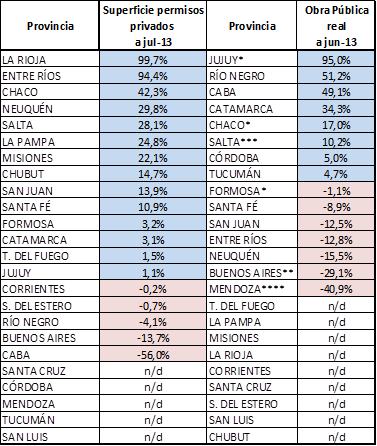 Respecto a la composición de la actividad, tomando la construcción privada la superficie autorizada a construir casi se duplicó en La Rioja (99,7%) y Entre Ríos (94,4%) entre enero a julio de este año con respecto al mismo lapso de 2012. También son importantes los aumentos de Chaco (42%), Neuquén (30%), Salta (28%) y La Pampa (25%). Por el lado de los repliegues en la CABA los permisos se desploman un 56%, siguiendo Buenos Aires con 14% y Río Negro con 4%. Corrientes y Santiago del Estero registran variaciones negativas mínimas. Adicionalmente, la obra pública del primer semestre ha tenido gran impulso en Jujuy (a marzo) con una expansión real (sin inflación) del 95%, continuando en el ranking Río Negro con 51%, la CABA con 49% y Catamarca que arroja un crecimiento del 34%. En sentido inverso los niveles de obra pública real sufrieron mermas en Mendoza (a agosto -41%), Buenos Aires (a abril -29%), Neuquén (-16%), Entre Ríos (-13%), San Juan (-13%), Santa Fe (-9%) y Formosa (a marzo -1%).