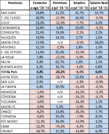 A pesar de que la construcción se ha reanimado en gran parte de las provincias, es interesante conocer cuáles han superado los efectos del cepo cambiario introducido en octubre de 2011. Considerando el consumo de cemento en el acumulado a agosto de 2013, 15 provincias ya superan el nivel observado en el mismo período de 2011, poco antes de las restricciones cambiarias: destacándose San Juan (34%), Tierra del Fuego (31%), Jujuy (23%), Catamarca (23%) y Corrientes (22%). Las restantes nueve provincias todavía no alcanzaron los niveles pre cepo, con importantes diferencias en los casos de Chubut, la CABA y Río Negro, para las que éstos son de 19% a 11% inferiores. En relación a los permisos de construcción privada, de las 19 jurisdicciones de las que se tiene información, en seis la superficie del acumulado a julio aún es menor a la del mismo período de 2011. Aquí lidera en caída la CABA con valores 74% inferiores, siguiendo Entre Ríos y Tierra del Fuego con diferencias de 18% promedio. El empleo en blanco del sector es más bajo que el vigente antes del cepo, destruyéndose puestos en la mayoría de las provincias (17) y con bajas muy profundas en Chaco (-26%) y Santiago del Estero (-22%). Asimismo en siete provincias los salarios reales todavía son más bajos que antes del inicio de las restricciones al tipo de cambio que entorpecieron las operaciones.