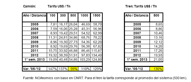 Esta situación se ve agravada por el hecho de que la producción se transporta en su mayor parte en el modo más caro, el camión. Mientras que en naciones como Canadá (64%), EEUU (53%) y Australia (53%) más de la mitad de la carga general se traslada por ferrocarril, en Argentina ese porcentaje resulta del 5%. En la última década la carga por tren oscila alrededor de las 24 millones de toneladas anuales (22 millones para 2012) cuando nuestra producción agrícola creció un 25% desde 84 millones de Tn en 2005 a 105 millones estimadas para 2013. Es decir que usamos en una porción ínfima el modo más barato, el tren. Como los costos fijos del tren son elevados, para distancias menores de 300 kilómetros el camión puede resultar atractivo por su flexibilidad, pero para distancias mayores los ahorros del tren son más evidentes y se acrecientan progresivamente. Por ejemplo, en 2012 para una distancia de 500 km el costo de transportar una tonelada a lo largo de un kilómetro ($/Tn/Km) era de $ 0,47 para el camión versus $ 0,18 del tren, es decir una diferencia del 62%. Para un recorrido de 1.000 kilómetros el tren es un 80% más barato que el camión, siendo 85% menos costoso para 1.500 kilómetros.