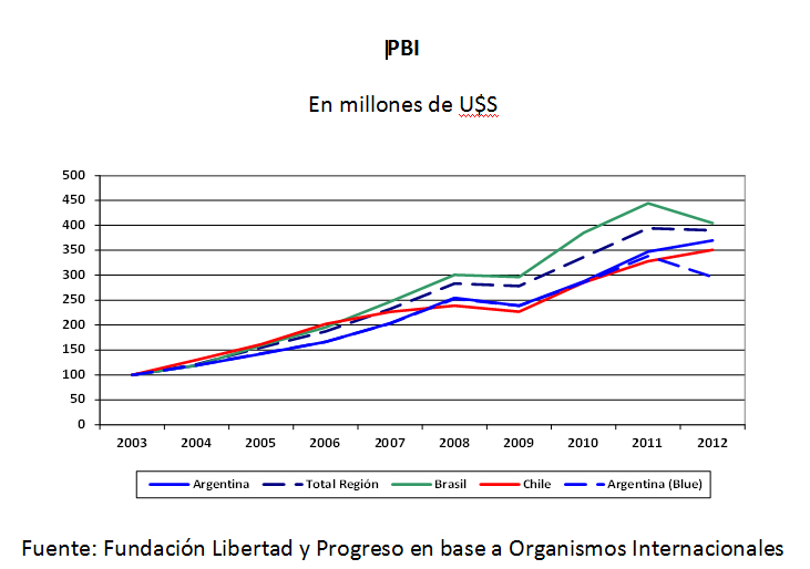 Para corroborar este crecimiento rezagado, podríamos comparar el crecimiento en dólares de Argentina, Brasil, Chile y la región de la última década tomando como año base el 2003. Se podrá observar que Brasil siempre creció por encima del promedio regional; que Chile y Argentina fueron muy parejos entre ellos (con la diferencia que Chile pudo crecer sin partir de una fenomenal crisis) pero por debajo del promedio y lo más llamativo, que Argentina a partir del 2008 se mantuvo siempre por muy poco arriba de Chile. El crecimiento promedio de la región para dicho lapso fue de 290%. Brasil logró superar el promedio regional al crecer en el período mencionado poco más de 300%, mientras que Argentina y Chile crecieron por debajo del promedio un 269,5% y 250% respectivamente. Sin embargo, si tomamos el dólar blue en la medición, Argentina creció 196%, alejándose notoriamente del crecimiento con respecto al dólar oficial y ubicándose además, por debajo del crecimiento registrado por Chile. En otras palabras, si se toma el tipo de cambio paralelo, a partir de 2011, Chile supera a Argentina en crecimiento económico.
