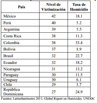 En una de las tablas del informe, se observa la brecha entre la victimización de las personas al ser encuestadas sobre la inseguridad y la tasa de homicidios, indicador que da cuenta de la cantidad de delitos violentos. Allí, se observa claramente cómo Argentina es el tercer país con menor tasa de homicidios después de Chile y Perú, y sin embargo se ubica tercero en la victimización.