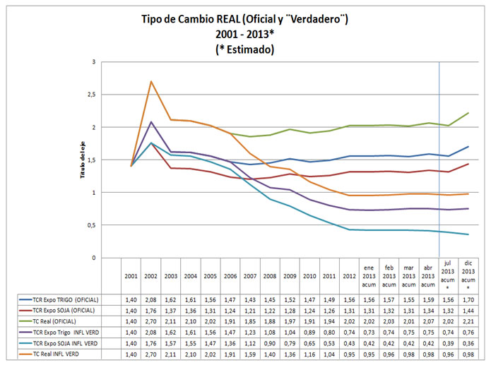 Este informe relaciona los tipos de cambio real (TCR) registrados para nuestra economía a partir del 2001 hasta estimaciones para fines del 2013, incluyendo no sólo la desacreditada inflación registrada por el IPC del Indec (oficial), sino también la inflación “verdadera” variable de aproximación de variación de precios internacionales, consideramos la inflación de los Estados Unidos durante la última década (IPC USA). Por otra parte, se incluye en este análisis técnico, las retenciones a las exportaciones en materia impositiva que el gobierno reglamentó con doble objeto: recaudatorio y de regulación de la oferta interna; para el trigo la alícuota vigente es del 23% del valor exportable y para la soja asciende al 35%. Es decir que ambos productores reciben un tipo de cambio sensiblemente menor en términos financieros al liquidar oficialmente sus exportaciones.