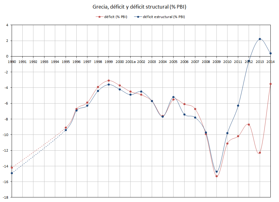 Pero antes de hablar de Grecia, es imperativa una breve aclaración para entender algunos de los eventos en torno a esta crisis. En economía se suele separar los conceptos de déficit y déficit estructural. El déficit estructural es el resultado fiscal en equilibrio. Es decir, sin el efecto de ciclos y fluctuaciones económicas. El déficit comprende al déficit estructural, más las oscilaciones fiscales que ocurren cada año. Si el presupuesto se encuentra en equilibrio estructural, entonces los superávit y déficit de cada año se cancelan y tienen como resultado un presupuesto balanceado en el mediano y largo plazo. El problema no es el déficit en sí, sino el déficit estructural (crónico).