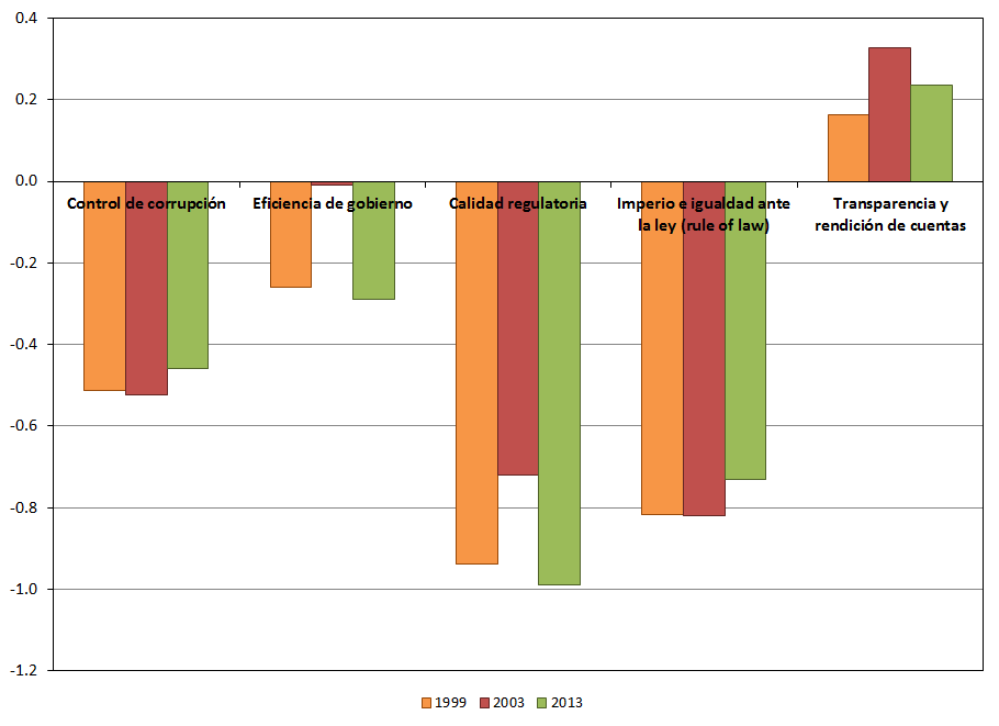 Si bien el último dato disponible es al 2013, los valores no dejan de ser representativos, dado que no se han dado importante mejoras en ninguna de estas variables. Los valores del 2013 se contrastan con dos puntos de referencia, el fin del menemismo (1999) y el inicio del kirchnerismo (2003). Dos lecturas se desprenden de estos datos. En primer lugar, doce años de gestión K no dejan una administración con una percepción claramente superior a la del fin del menemismo. Por ejemplo, el fin del mandato K muestra un leve empeoramiento en eficiencia de Gobierno y calidad regulatoria. En otras palabras, Argentina estaría algo mejor regulada por el menemismo, más allá de lo pobre que podamos considerar su desempeño. En segundo lugar, el kirchenismo muestra más empeoramientos que mejoras respecto al 2003.