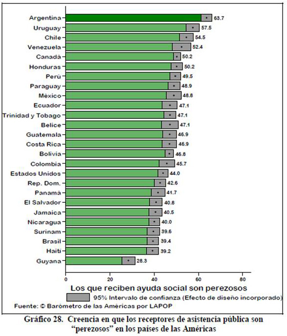 Según esta encuesta realizada a más de 1.500 personas en todo el país, en una escala de 0 a 100, la Argentina sumó 63,7 puntos en cuanto al acuerdo de que son “vagos” quienes reciben ayuda social. En el continente le siguen Uruguay (57,5), Chile (54,5) y Venezuela (52,4). Muy por debajo se ubican Estados Unidos (44) y Brasil (43,4).
