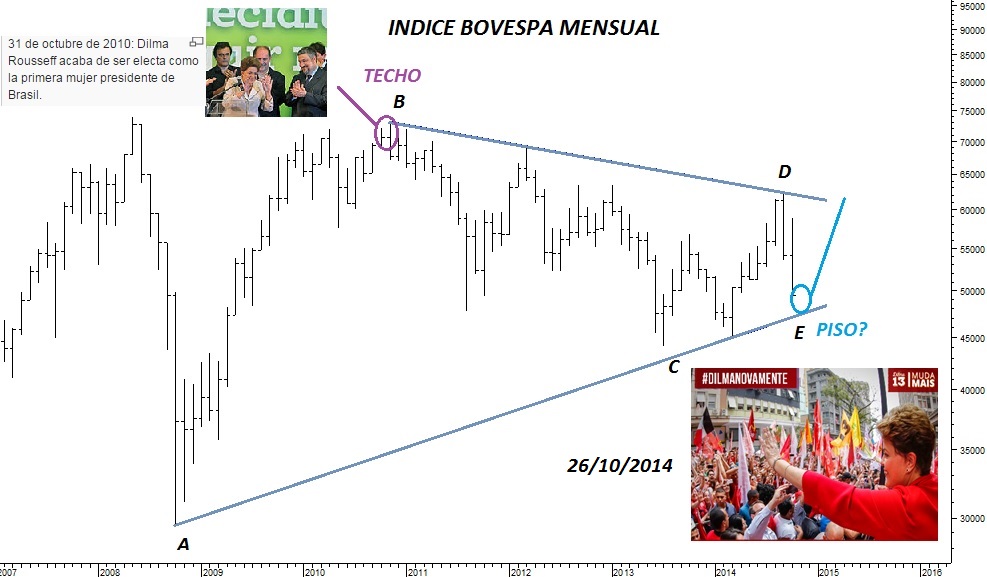 Si nos retrotraemos a la primera elección presidencial que gana Dilma Rousseff en octubre del año 2010, en dicha oportunidad el índice Bovespa se encontraba testeando valores históricos de 70000-73000 puntos y tras el rally de festejo que hizo el mercado en dicha oportunidad, entendiendo que el gobierno de Dilma sería una continuación del gobierno de Lula Da Silva, el mercado alcanzó su techo histórico y desde entonces se habilitó el proceso de corrección mayor, que se ha prolongado hasta el presente año, para alcanzar actualmente niveles de Bovespa en torno a los 50000-46000 puntos.