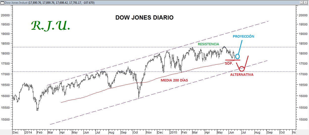 Centrando nuestra atención en la bolsa estadounidense, considerando el índice Dow Jones como principal variable, se identifica la zona de 17650-17550 puntos como el soporte más cercano de importancia, que está definido por la media de 200 días y por mínimos correctivos previos de este índice, conseguidos en el mes de marzo pasado. Creemos que, en la medida en que esta zona de soporte no sea quebrada ante mayores debilidades, desde aquí mismo el avance del índice podría quedar retomado, buscando regresar hacia la zona de máximos históricos de 18300-18350 puntos o bien accediendo hacia niveles superiores; ello sería buscando la parte superior del canal alcista en curso, en torno a los 19300-19500 puntos.