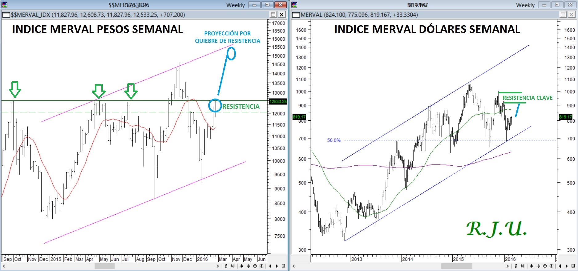 Es que la realidad nos indica que si analizamos el mercado en términos de pesos, bien podríamos pensar en mayores avances para el índice, que regresen el Merval hacia los máximos históricos alcanzados en noviembre pasado, de 14.600 puntos, o bien accedan hacia objetivos algo más ambiciosos, de 15.000-15.500 puntos. En tal caso, el índice necesita superar la zona de 12.600-12.650 puntos y con ello el camino ascendente hacia los objetivos proyectados quedará liberado.