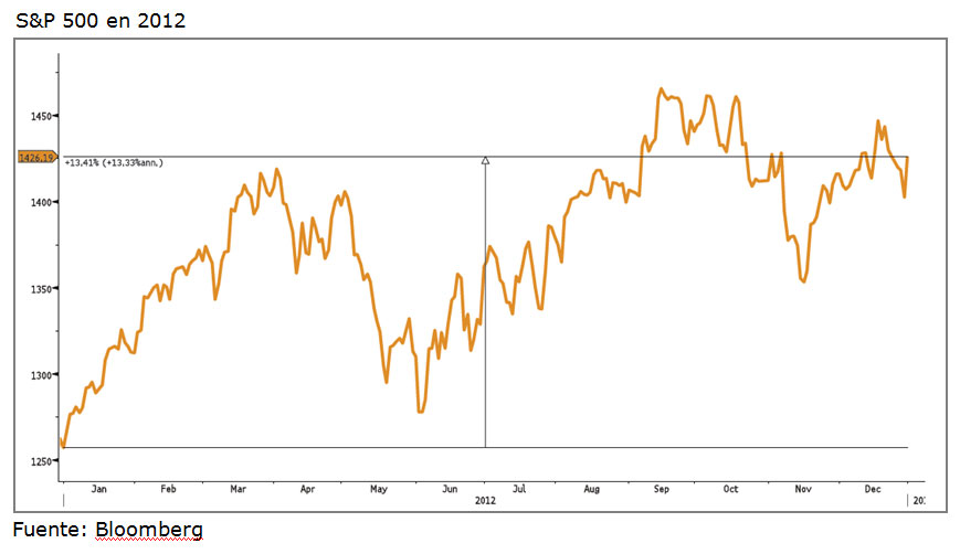 Después de tensiones en Europa, aterrizaje de la economía China, conflicto en Medio Oriente, economía lánguida en EEUU y Europa, elecciones en EEUU, y un abismo fiscal sin resolver, el índice accionario S&P 500 cerró el año en 1,426, un retorno (excluyendo dividendos) de 13.4% en el 2012. Sin embargo el mercado americano no fue el único que acompañó la fiesta, pues varias bolsas en Europa, Asia, y Latinoamérica también generaron retornos de doble dígito: Grecia 33%, Alemania 29%, Irlanda 17%, Francia 15%, México 18%, Argentina 16%, Colombia 17%, Japón 10%, entre otras. Por otra parte, el agregado de las materias primas y los bonos también generaron ganancias para nada despreciables en el año.