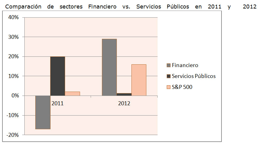 En EEUU, la comparación del desempeño de las acciones americanas en 2011 y 2012 pone en evidencia la bondad que tuvo el diversificar entre industrias y sectores. Por ejemplo, para el 2012 el sector con mejor desempeño fue el financiero con una ganancia total de 29% cuando en 2011 fue el peor sector con una caída de 17%. En contraste, el sector de servicios públicos fue el peor sector en 2012 con un retorno de 1.3%, sin embargo, en 2011 el sector tuvo el mejor desempeño al retornar 19.95%.